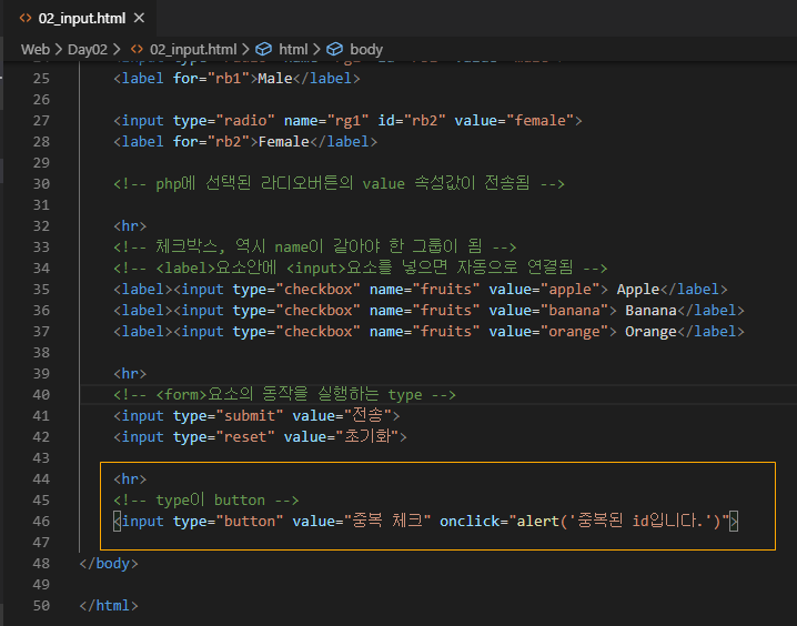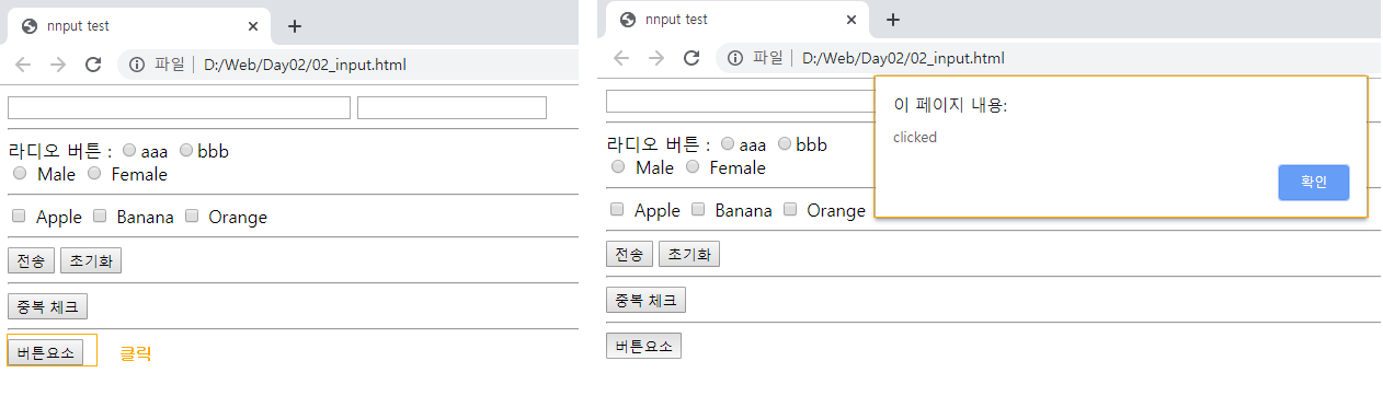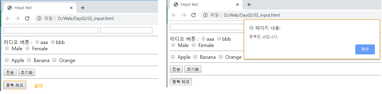 <input type="button" value="중복 체크" onclick="alert('중복된 id입니다.')">