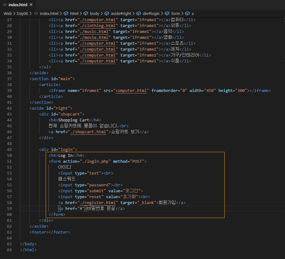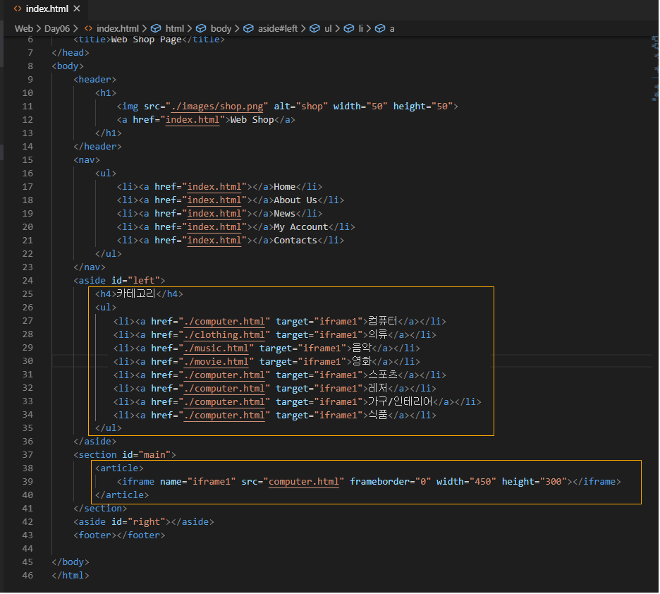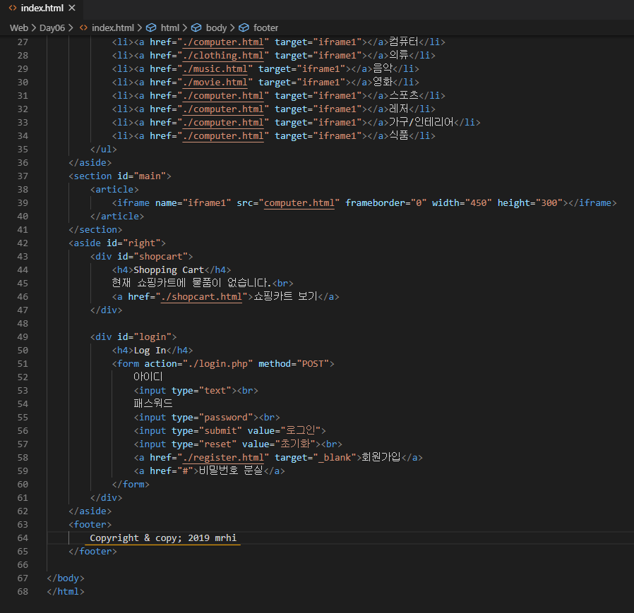 이제 카테고리를 만들고, 카테고리를 눌렀을 시 보여줄 iframe을 section영역에 만들자.