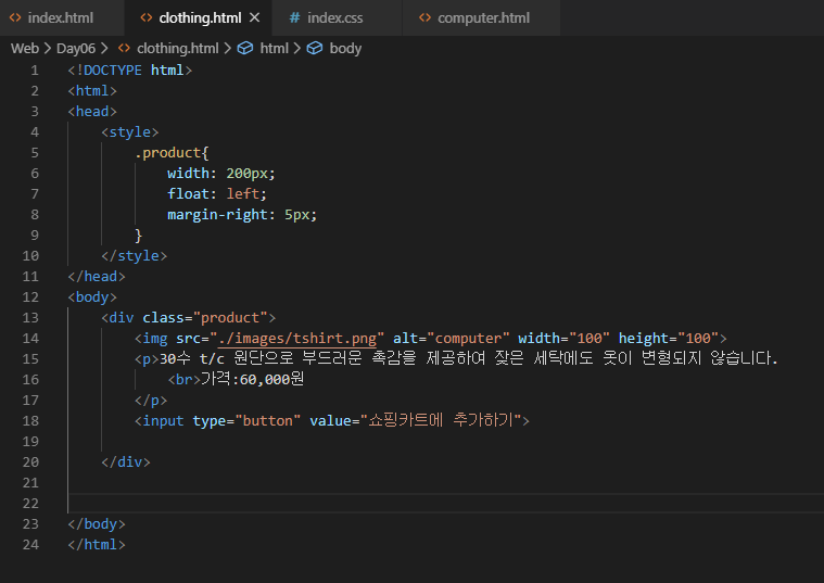 index.html에 이미 링크를 걸어두었지만, 만들지 않은 colthing.html 파일을 만들자.