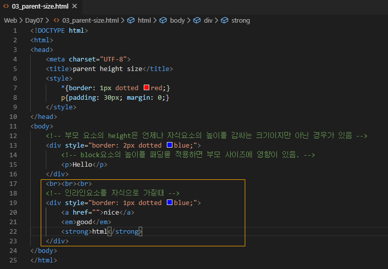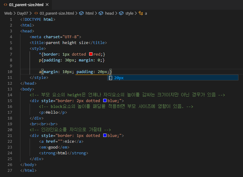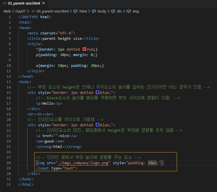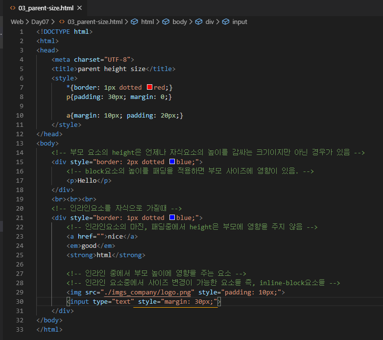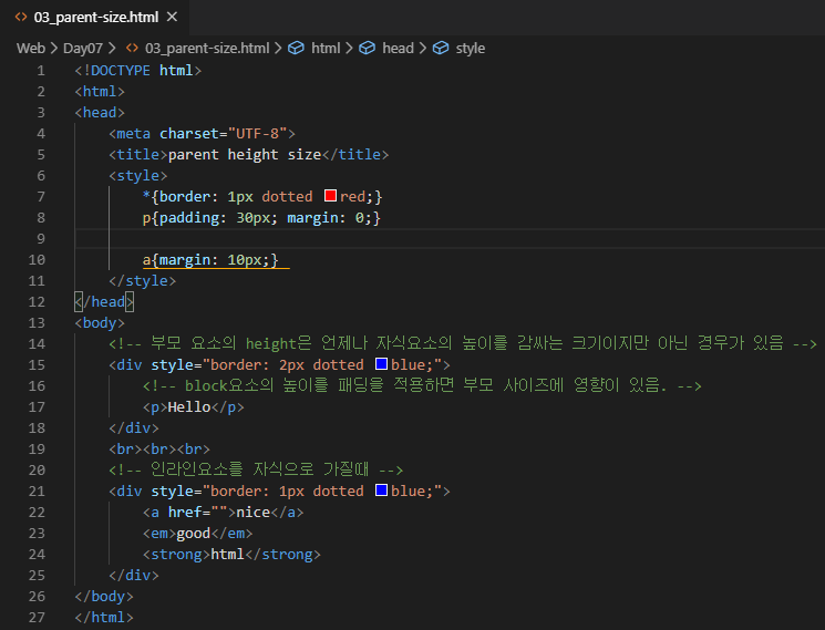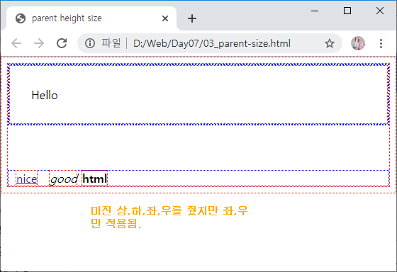 <!-- 인라인요소의 마진, 패딩중에서 height은 부모에 영향을 주지 않음 -->