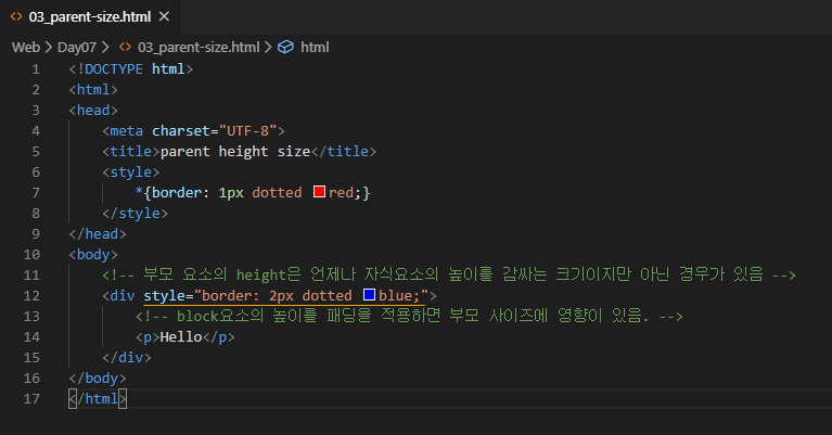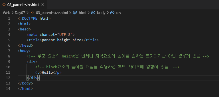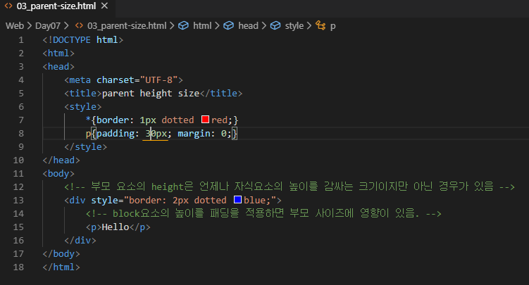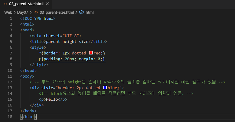 <!-- block요소의 높이를 패딩을 적용하면 부모 사이즈에 영향이 있음. -->