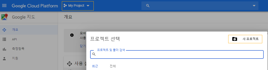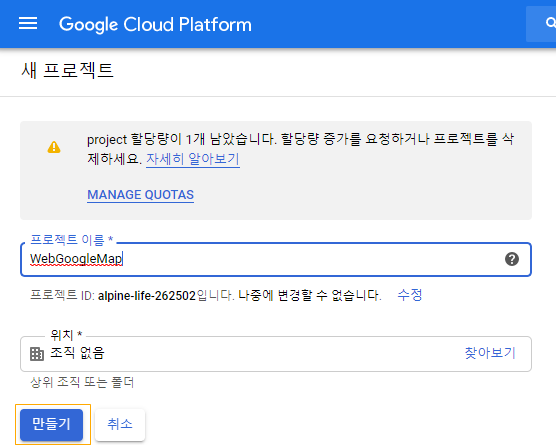 새 탭으로 열어서 Google Cloud Platform에 왔다. 새로 프로젝트를 만들자.