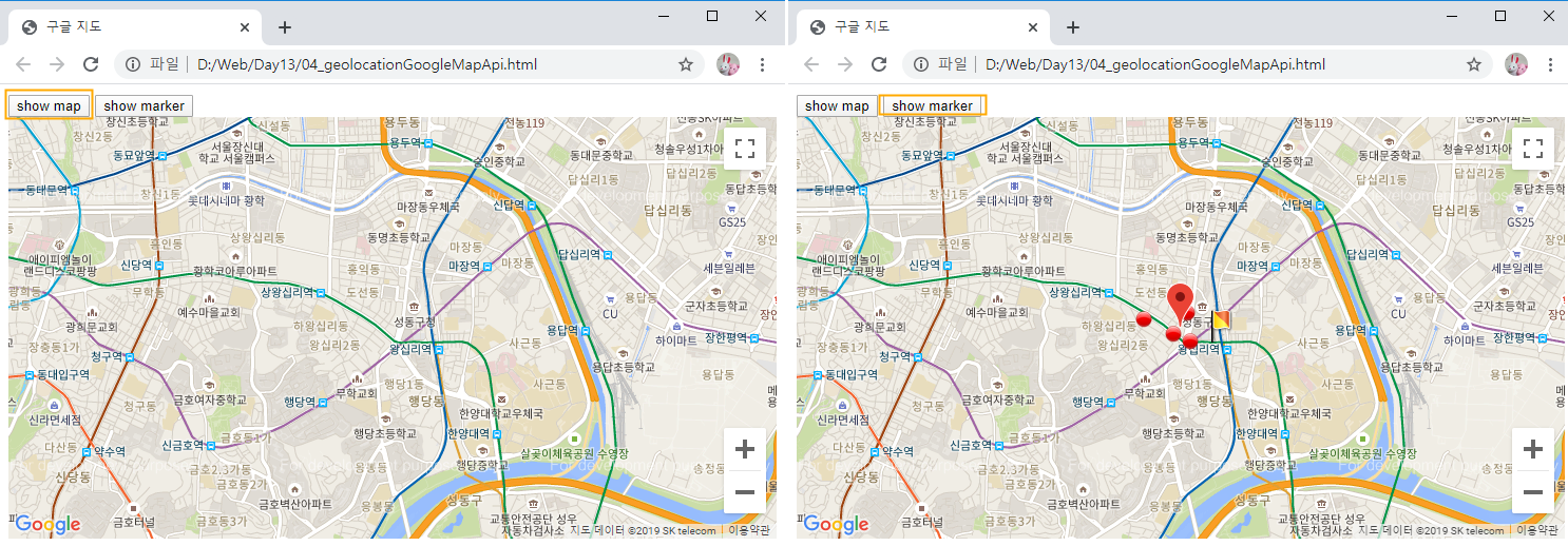 show marker 버튼을 누르면 지도에 해당 위치에 구글이 제공하는 이미지가 표시된다.