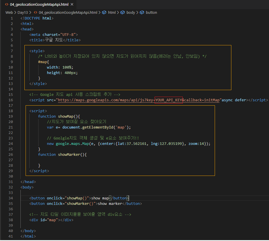 아래 코드만 쓰면 show map버튼을 눌렀을 시, 지도가 보일 것이다.
