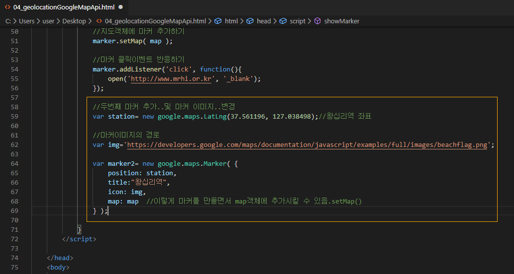 지도에 마커도 표시 해보자.