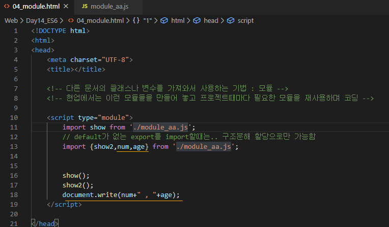 <!-- 다른 문서의 클래스나 변수를 가져와서 사용하는 기법 : 모듈 -->