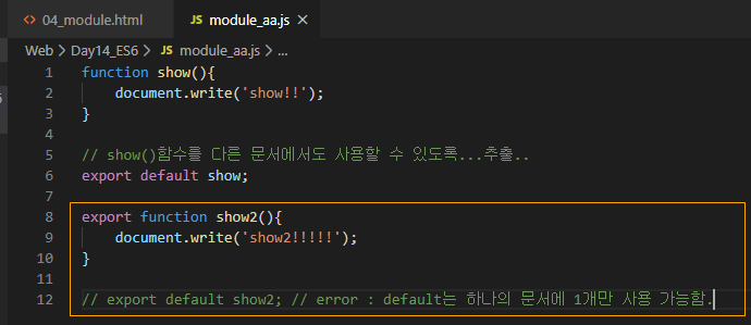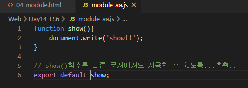 함수 show()를 만들었다. 그리고 다른 문서에서 사용을 하려면 esport default를 해야 사용가능하다.