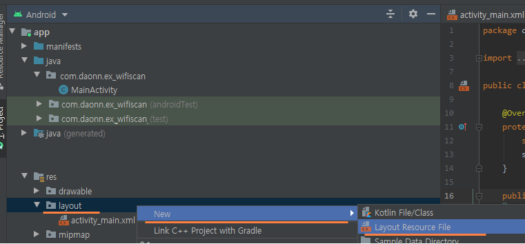 이제 화면에 보여질 activity_main.xml을 작성해 줍니다.