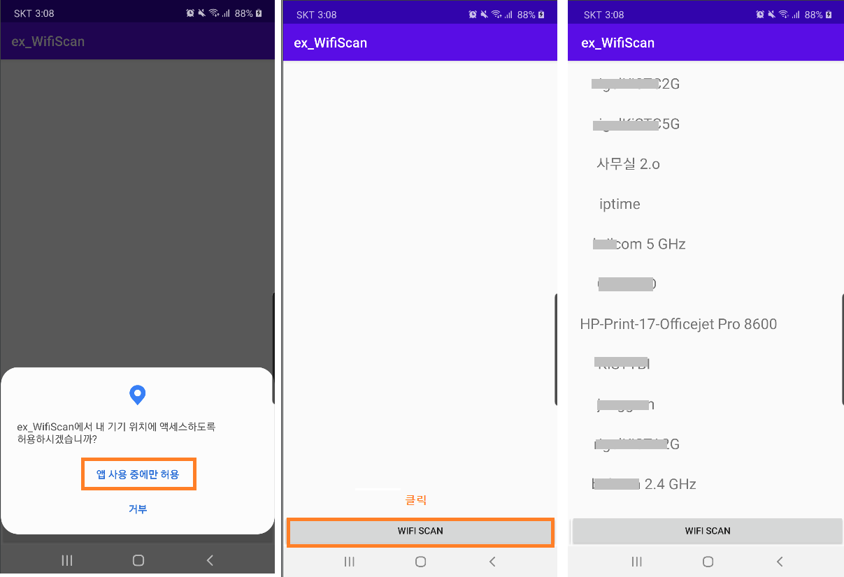 <실행 화면> 버튼을 클릭하면 현재 위치에 잡히는 Wifi를 정보를 가져와서 보여줍니다.