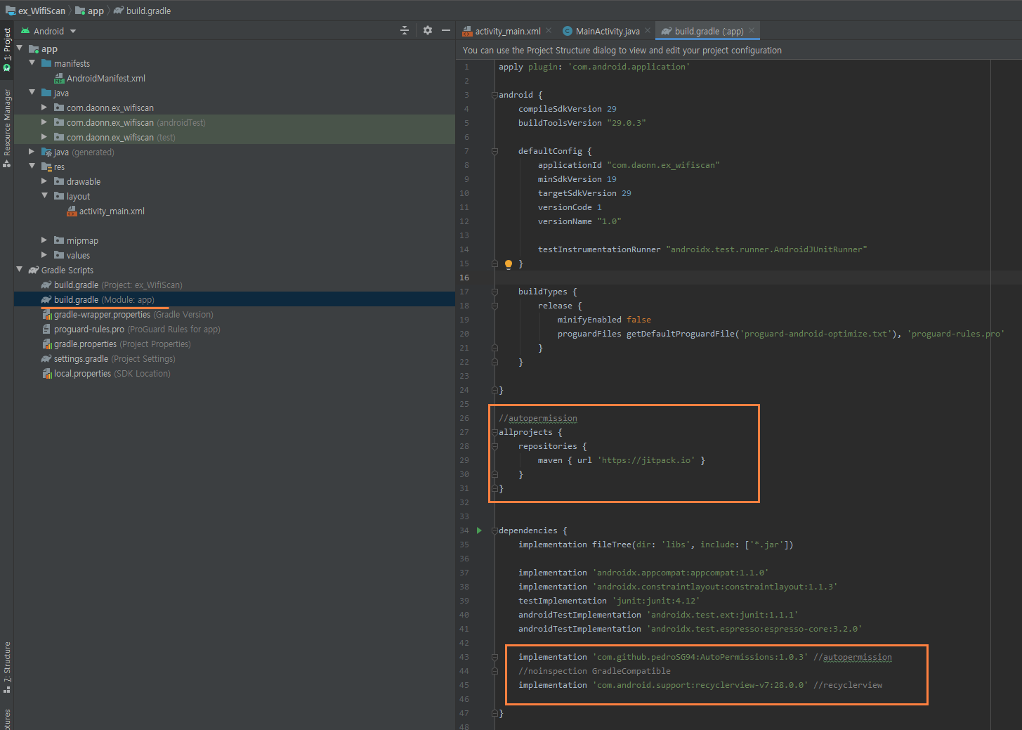 우선 Autopermissions, recyclerview에 관한 라이브러리를 추가하겠습니다.