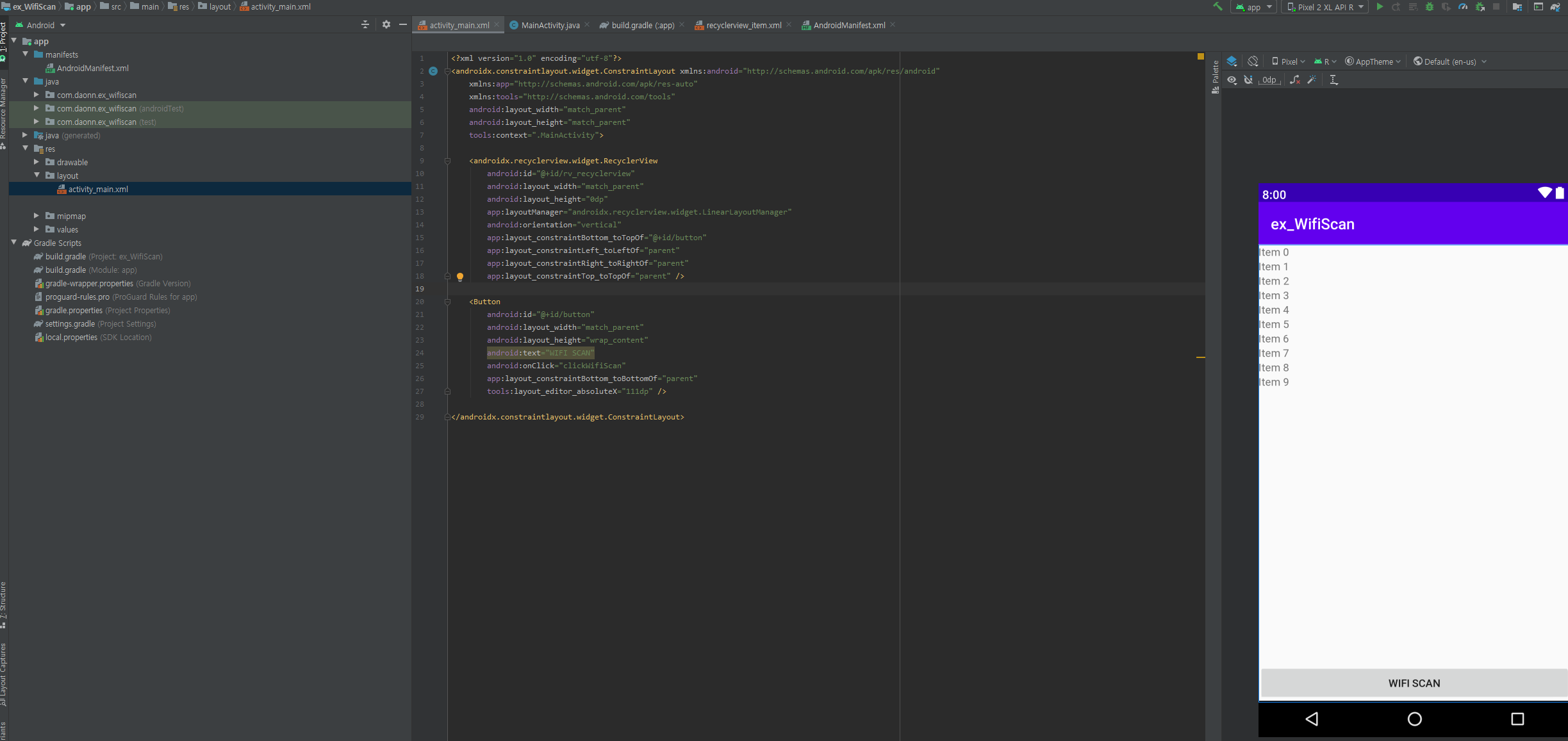 버튼을 누렀을 시 wifi를 scan합니다. 그리고 그 정보를 recyclerview로 보여줍니다.