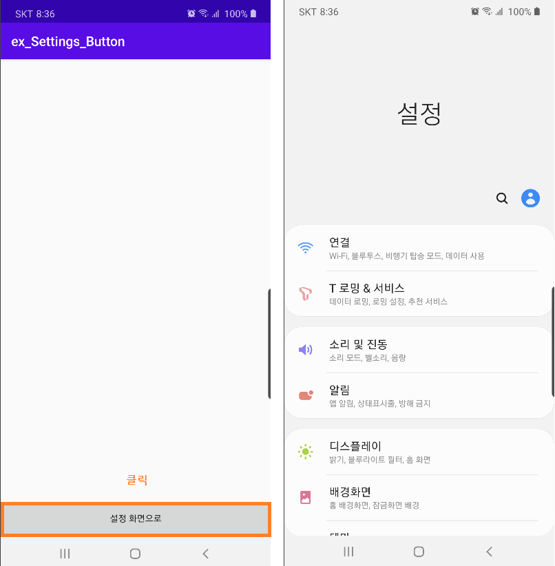 필요에 의해서 휴대폰의 설정 화면으로 가게끔 하고 싶을 때 사용합니다.