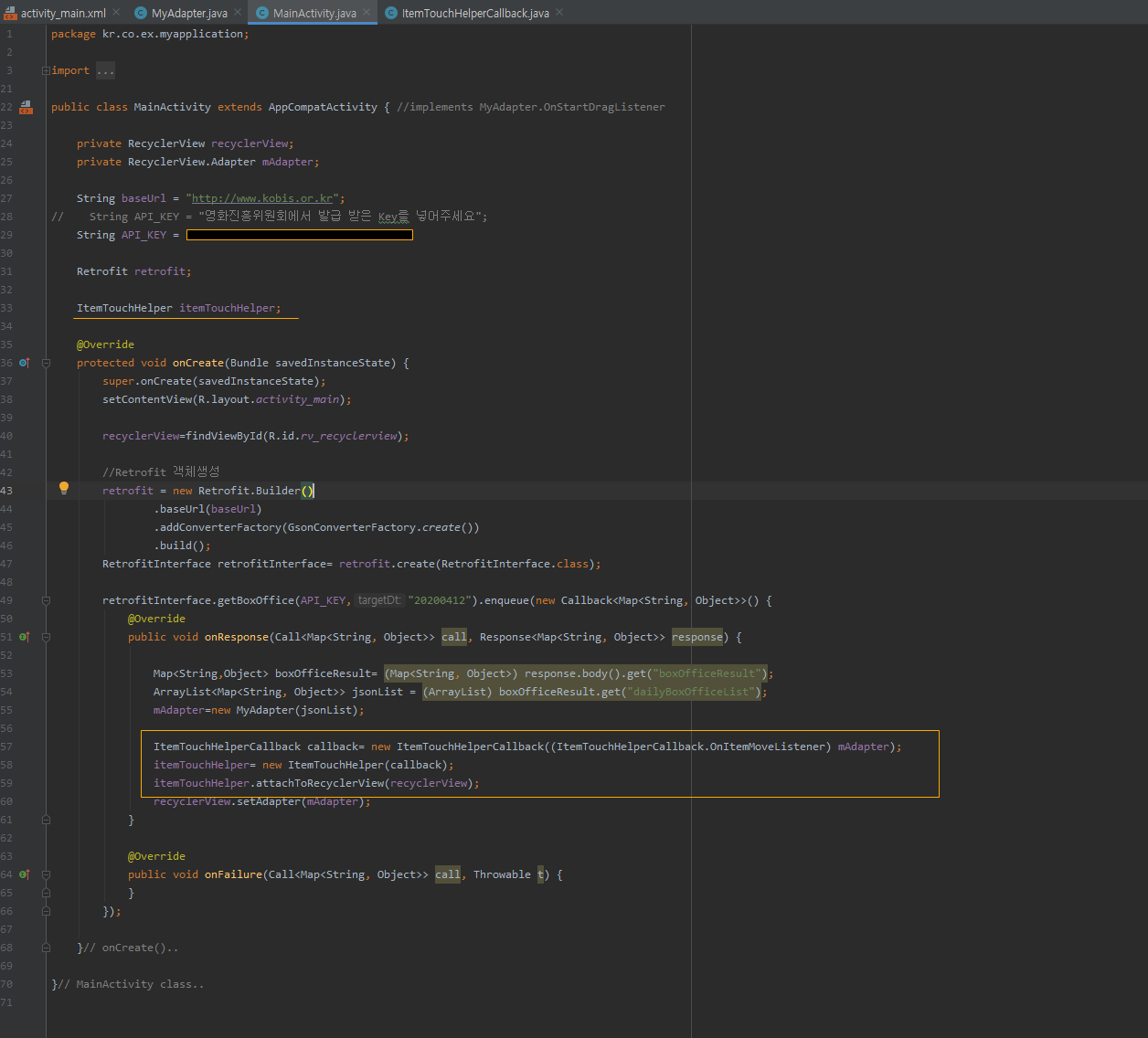 2020/03/22 - [안드로이드/개발자 일상] - 안드로이드 Retrofit2+RecyclerView 1-1(영화진흥위원회 오픈 API 이용)