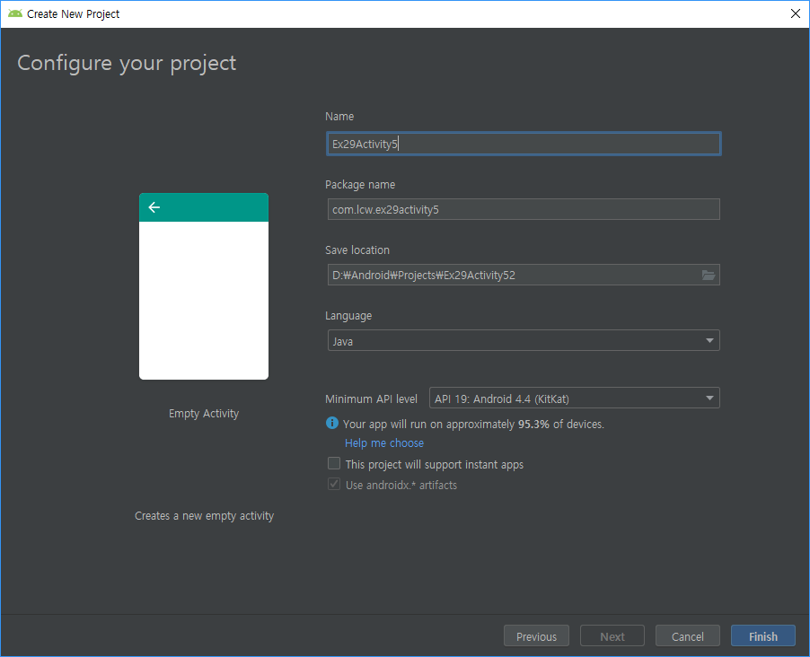 이렇게 EX29 새로운 프로젝트를 만들었다. 하지만 위에서 EX28번 mainfest.xml에 Second에 "aaa"를 기입해놨기 때문에