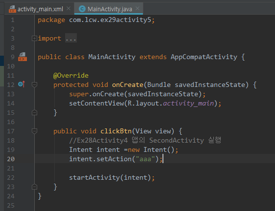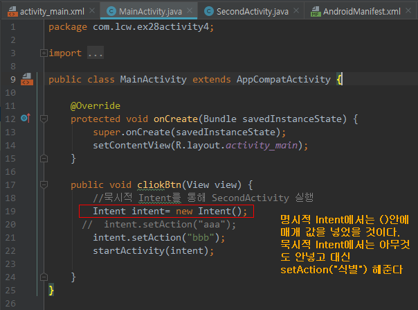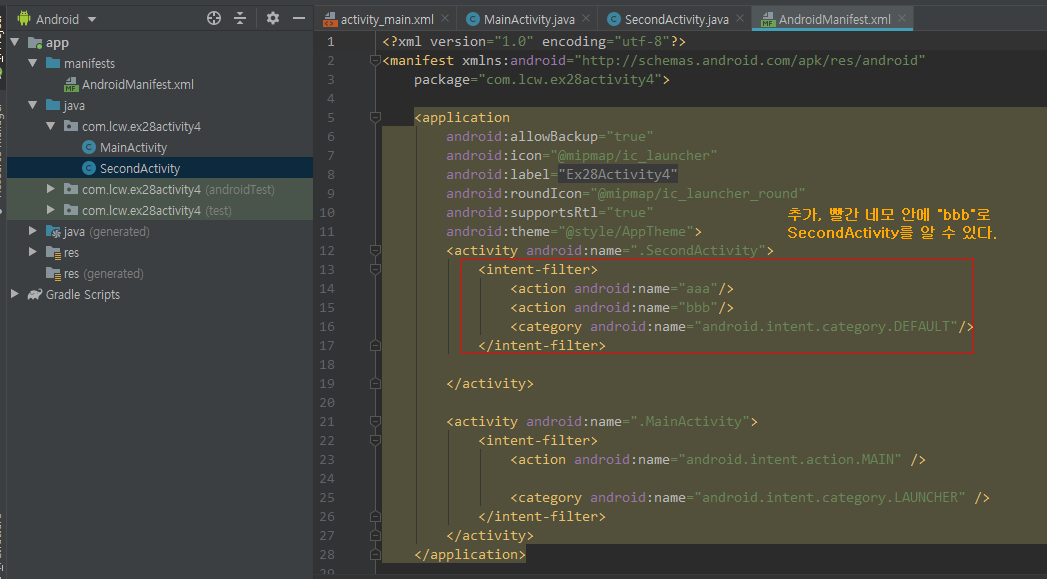 이 식별을 위한 "bbb"는 SecondActivity를 실행할 식별자인셈이다. 이것을 SecondActivity에 써주면 끝난다.